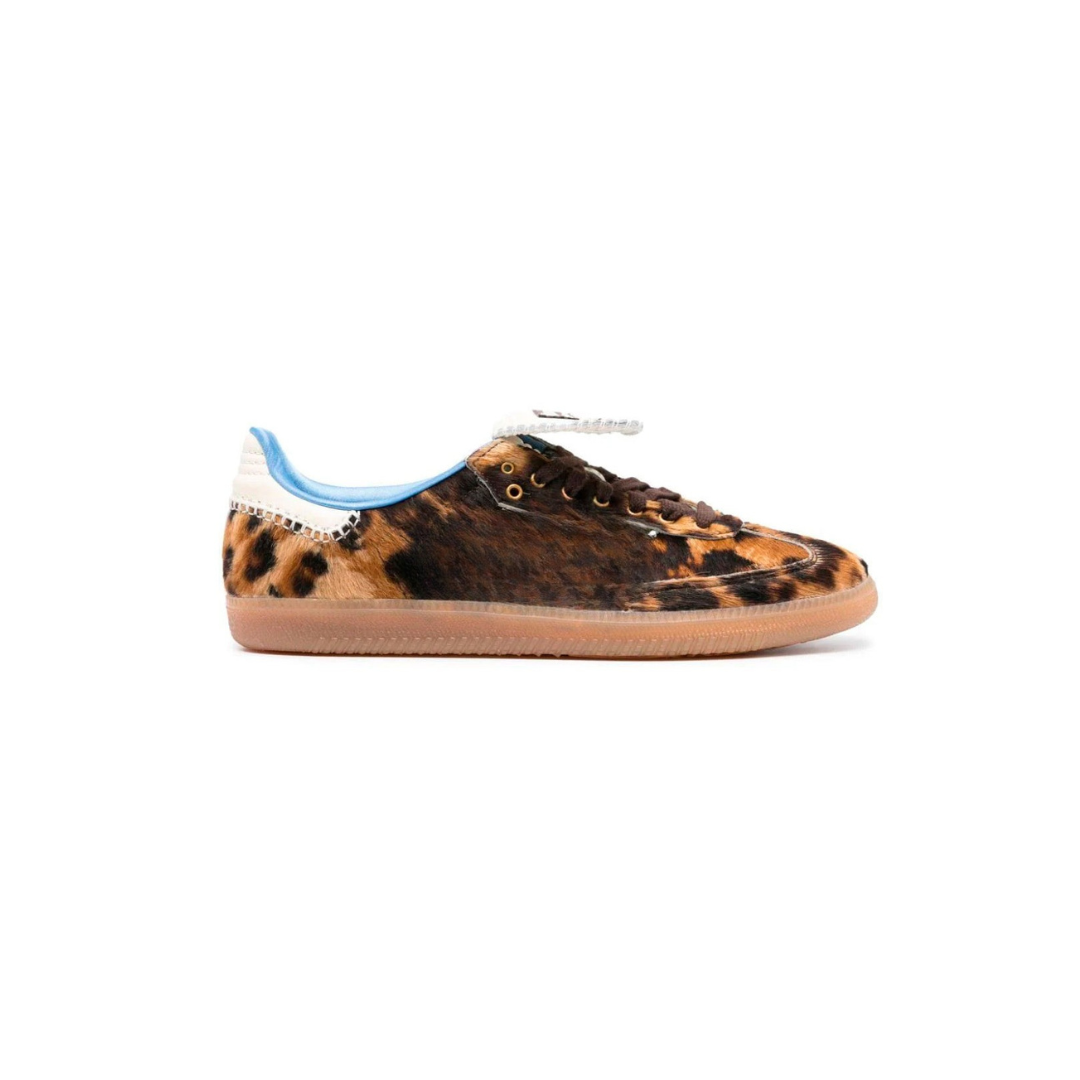 Brown, multicolor, paneled design, textured finish, leopard print, detail, logo patch on tongue, oversized tongue, contrast heel, lace-up front closure, round toe, insole with logo and flat rubber sole.